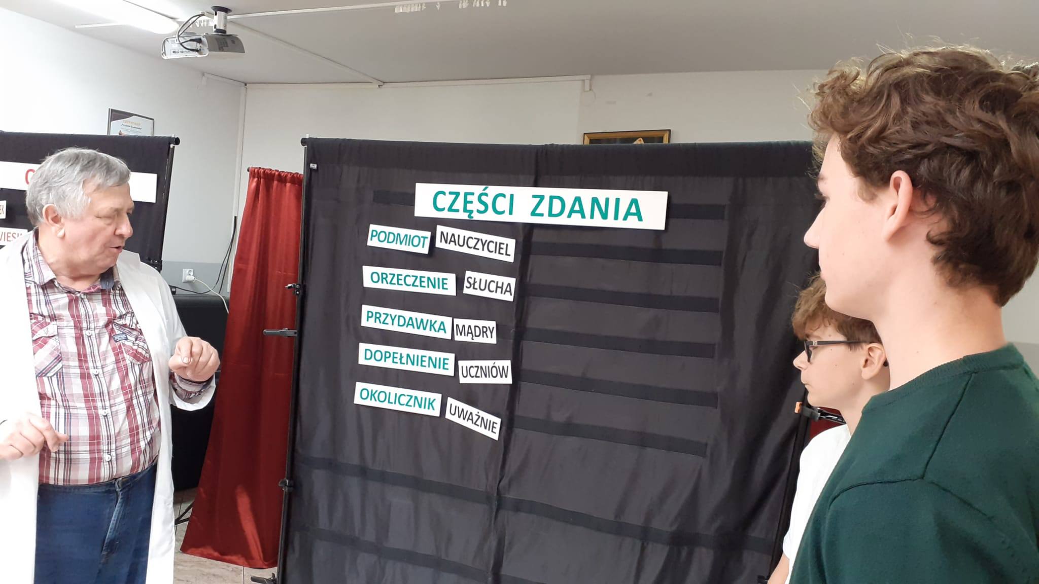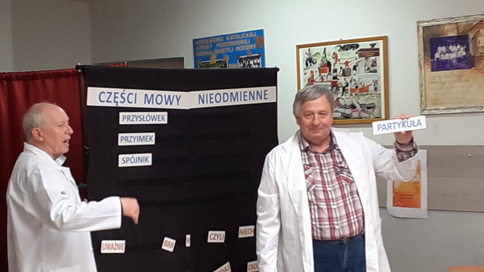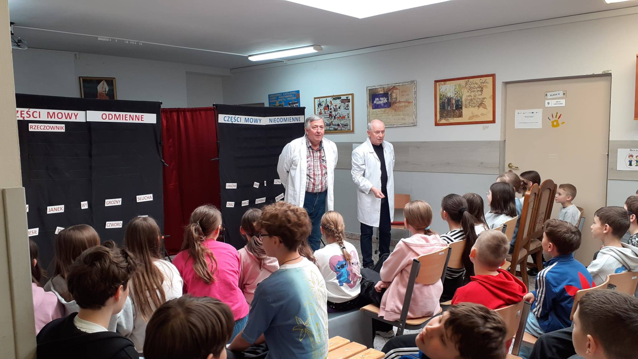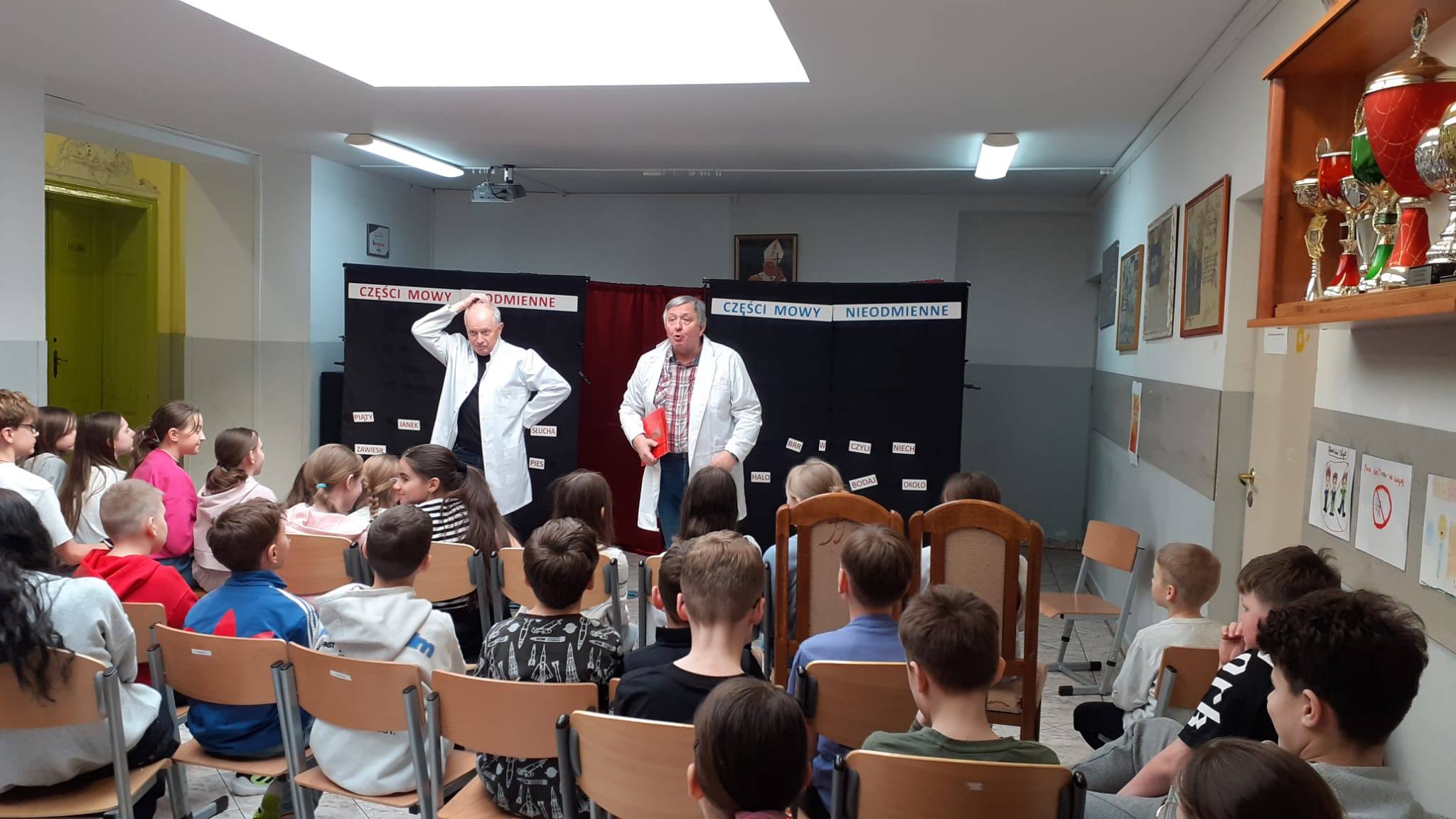 Oczywiście, zwłaszcza, gdy opowiadają o niej aktorzy scen krakowskich: Jacek Lecznar i Wojciech Habela.🤩 Panowie odwiedzili naszą szkołę, aby razem z uczniami klas IV – VIII odkrywać sekrety części mowy i zdania. Wiele radości sprawiły uczestnikom warsztatów także wiersze znanych poetów, których recytacja ubogaciła gramatyczne rozważania.