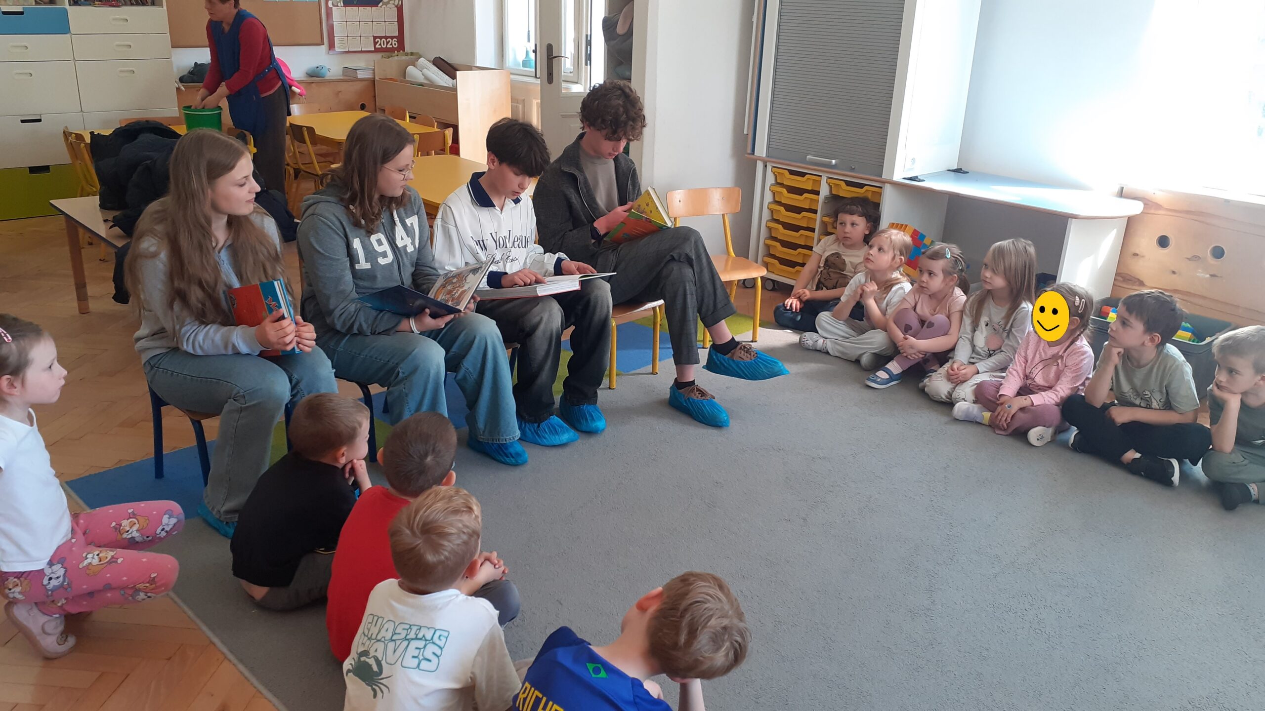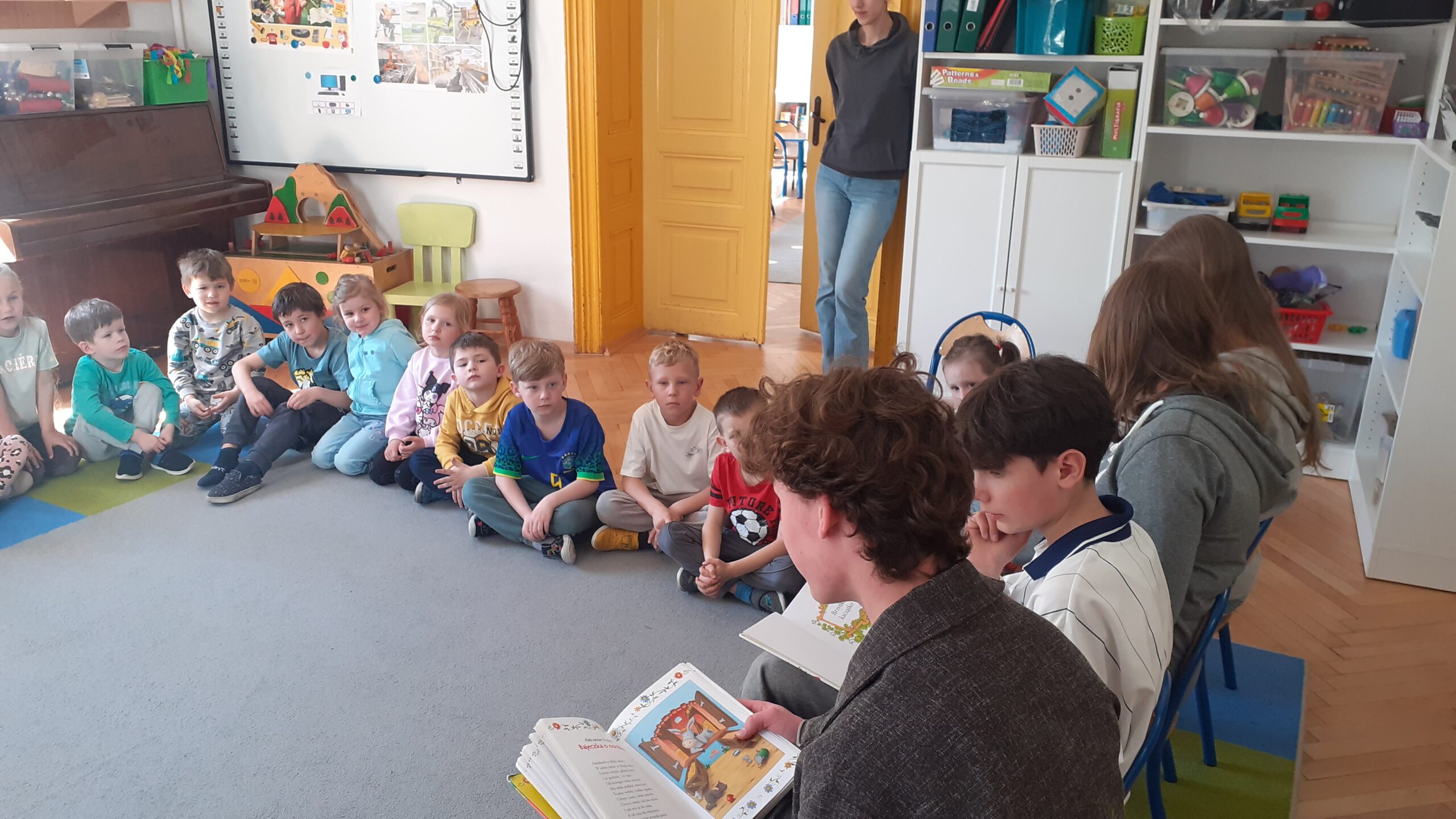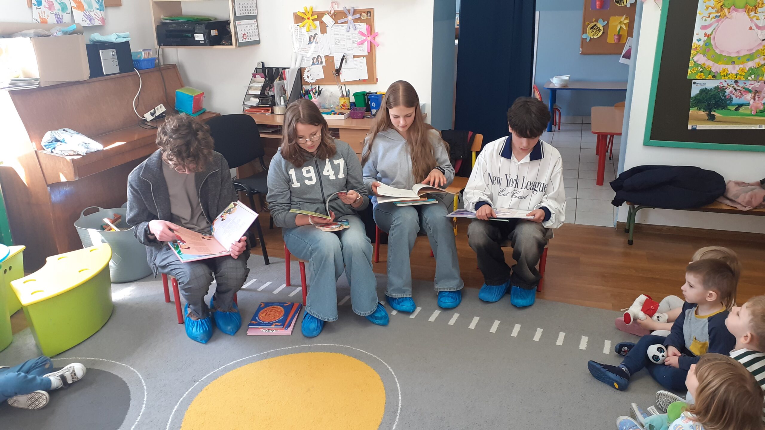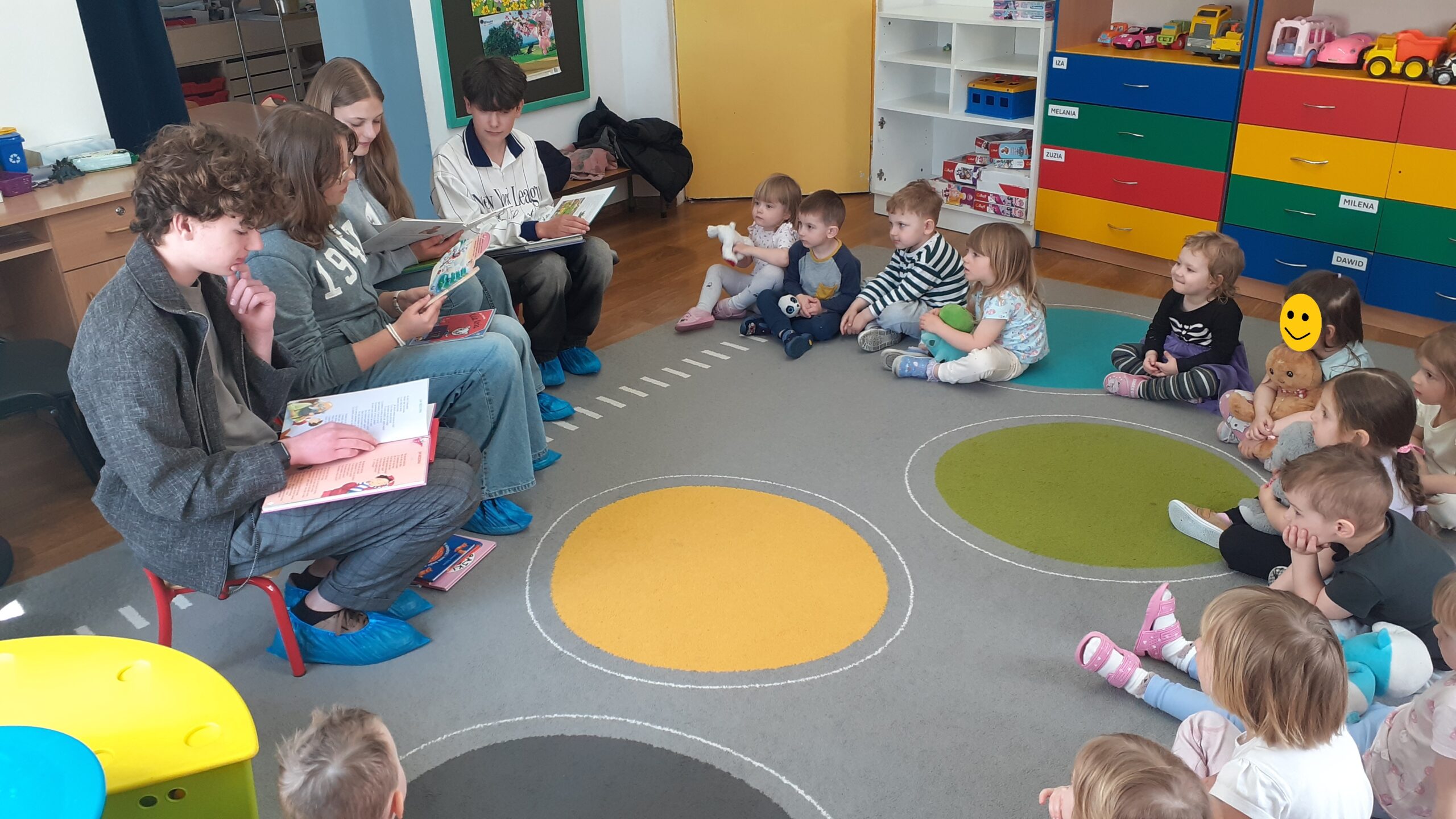 Ósmoklasiści zostali zaproszeni przez Panią Dyrektor Beatę Klimczak, aby poczytać przedszkolakom bajki. Nasi uczniowie z radością i zapałem przystąpili do tego zadania. Odwiedzili wszystkie grupy przedszkolne – maluchy, średniaki i starszaki. Dzięki czytanym przez naszych uczniów wierszom i opowieściom, przedszkolaki mogły odwiedzić kolorowy, bajkowy świat. Po skończonych zajęciach Panie wychowawczynie i dzieci ładnie podziękowały naszym uczniom i poprosiły, aby jeszcze je odwiedzić i poczytać kolejne bajki.