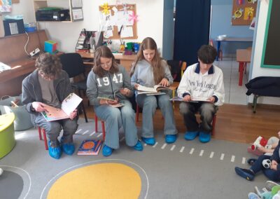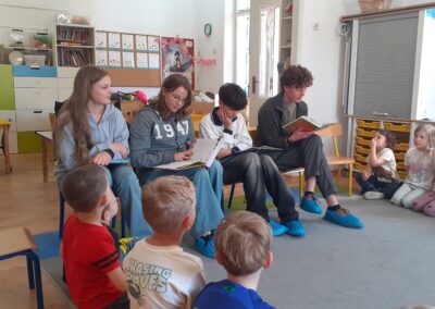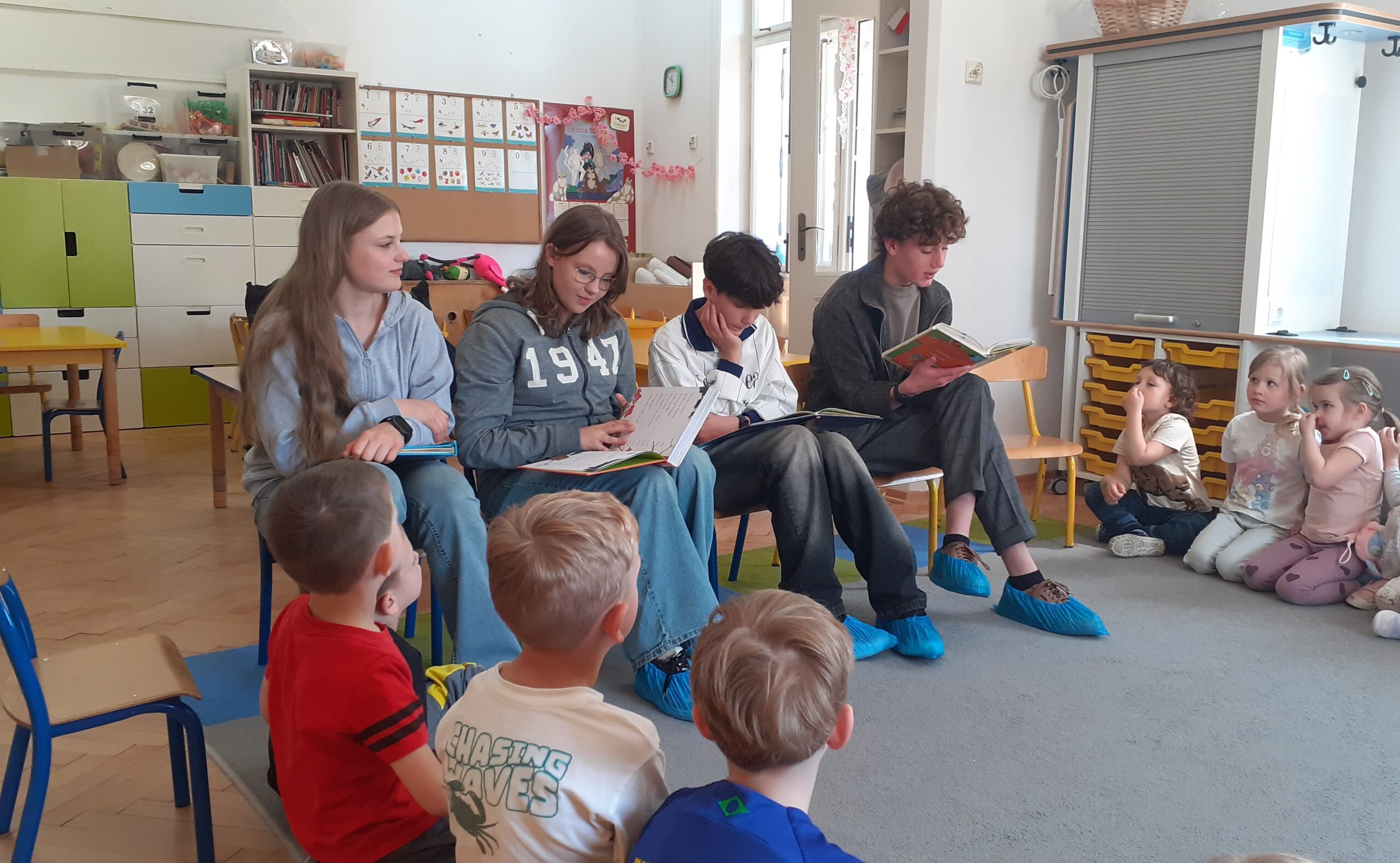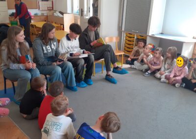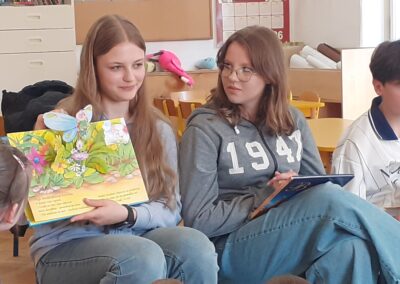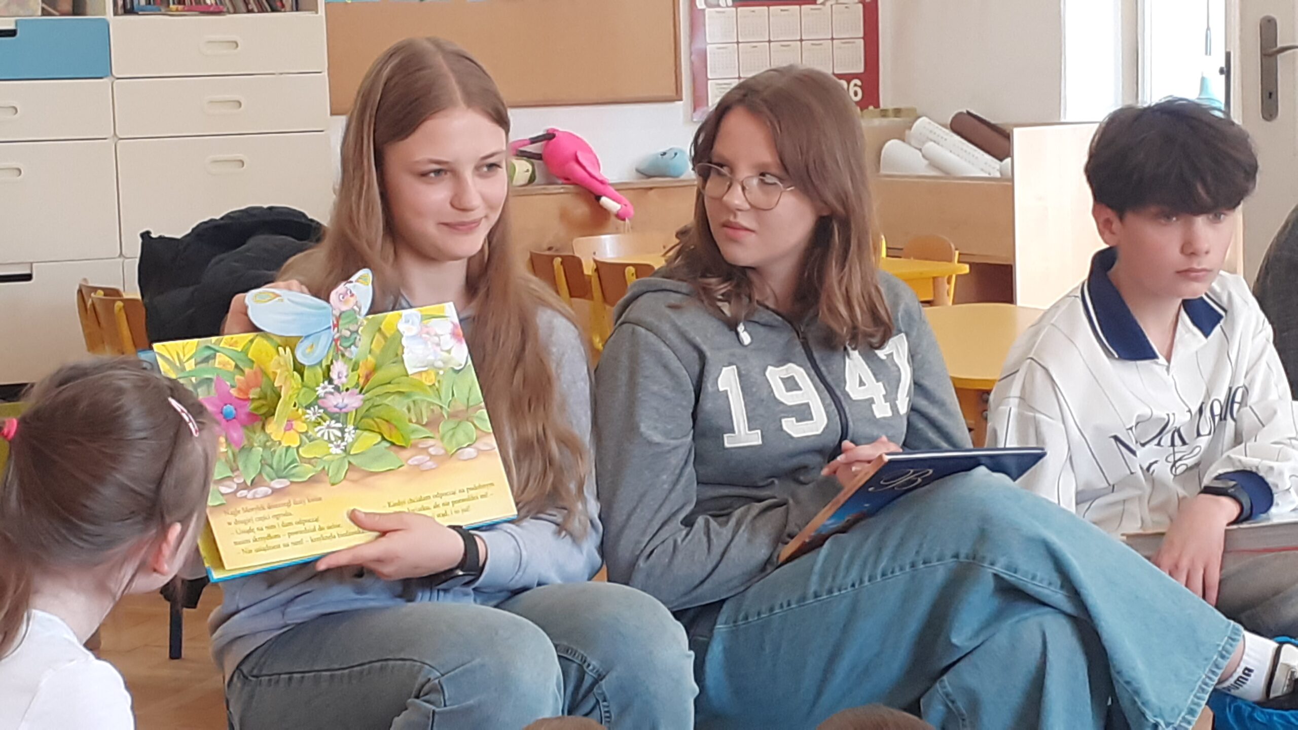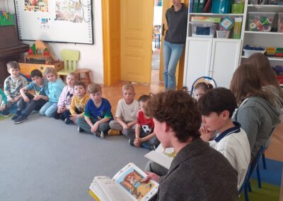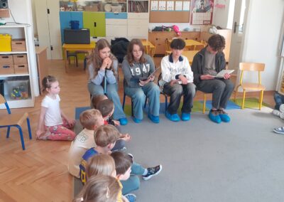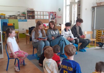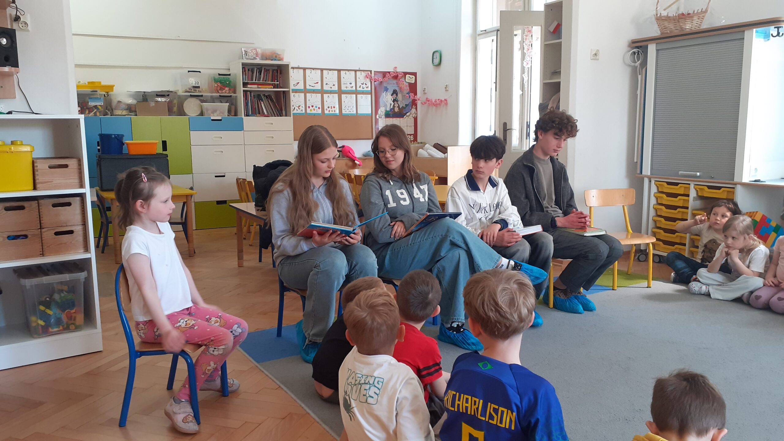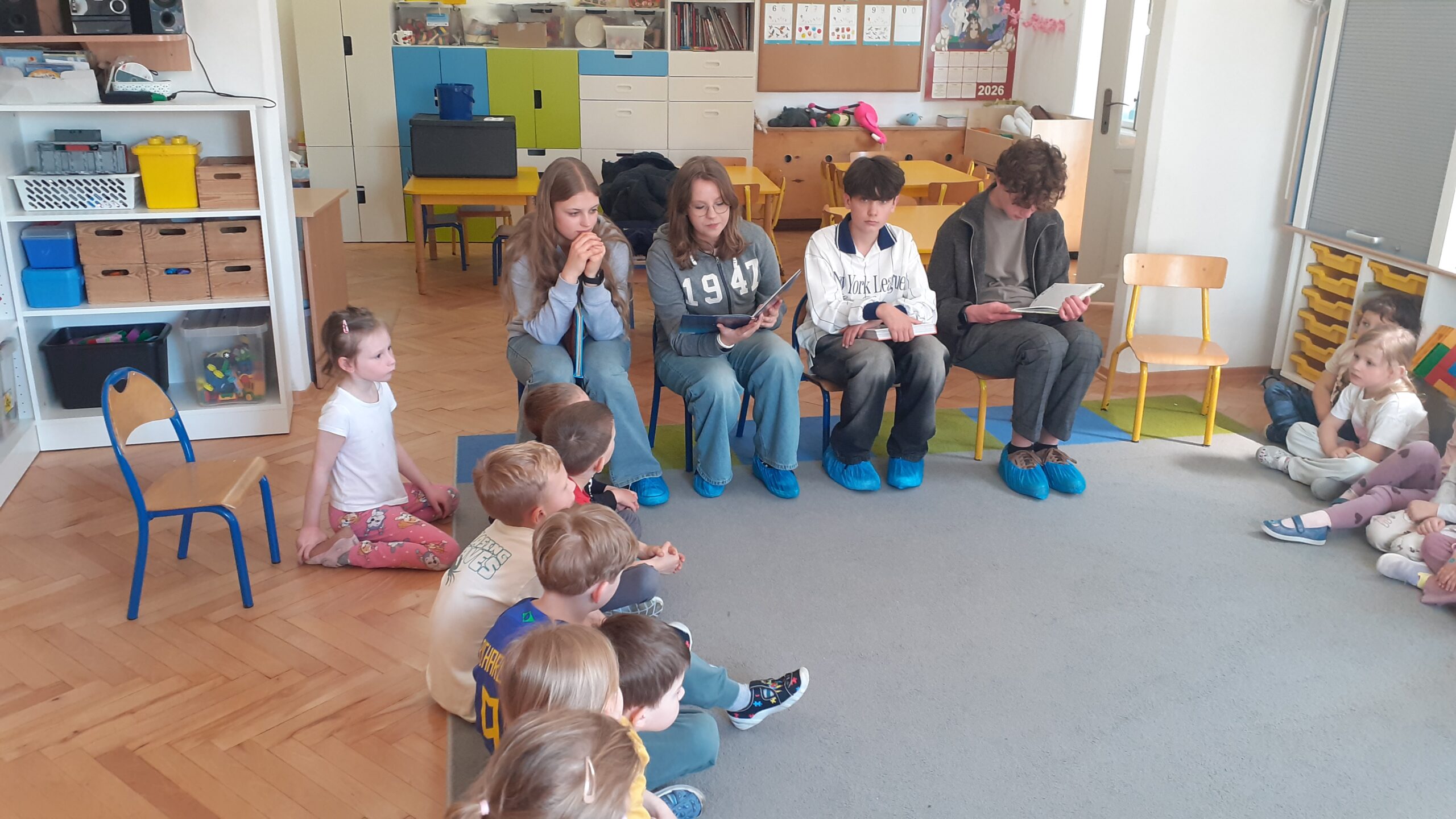Ósmoklasiści zostali zaproszeni przez Panią Dyrektor Beatę Klimczak, aby poczytać przedszkolakom bajki. Nasi uczniowie z radością i zapałem przystąpili do tego zadania. Odwiedzili wszystkie grupy przedszkolne – maluchy, średniaki i starszaki. Dzięki czytanym przez naszych uczniów wierszom i opowieściom, przedszkolaki mogły odwiedzić kolorowy, bajkowy świat. Po skończonych zajęciach Panie wychowawczynie i dzieci ładnie podziękowały naszym uczniom i poprosiły, aby jeszcze je odwiedzić i poczytać kolejne bajki.