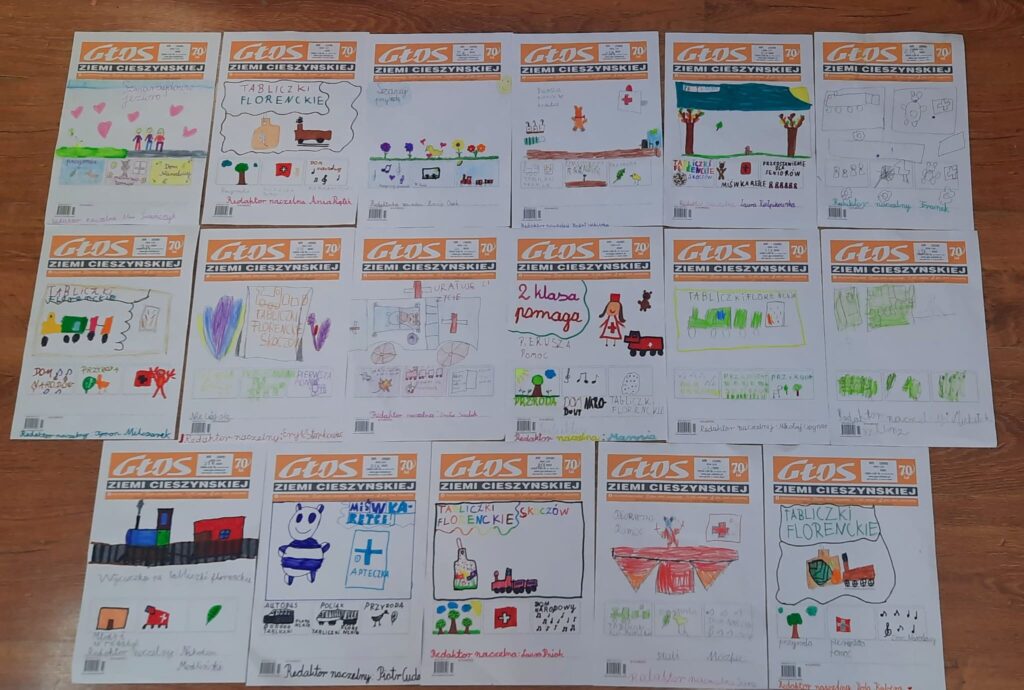 Po powrocie do szkoły każdy uczeń stworzył własny projekt okładki gazety, opowiadający o naszych klasowych wydarzeniach – kto wie, może właśnie wśród nich rośnie przyszły redaktor naczelny „Głosu Ziemi Cieszyńskiej”?