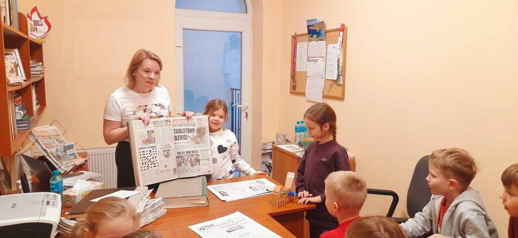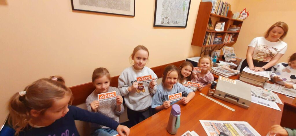 Podczas wizyty w siedzibie Głos Ziemi Cieszyńskiej uczniowie dowiedzieli się, jak powstaje gazeta, zobaczyli pierwszy numer tego lokalnego tytułu, a także akcesoria redaktorów sprzed 70 lat