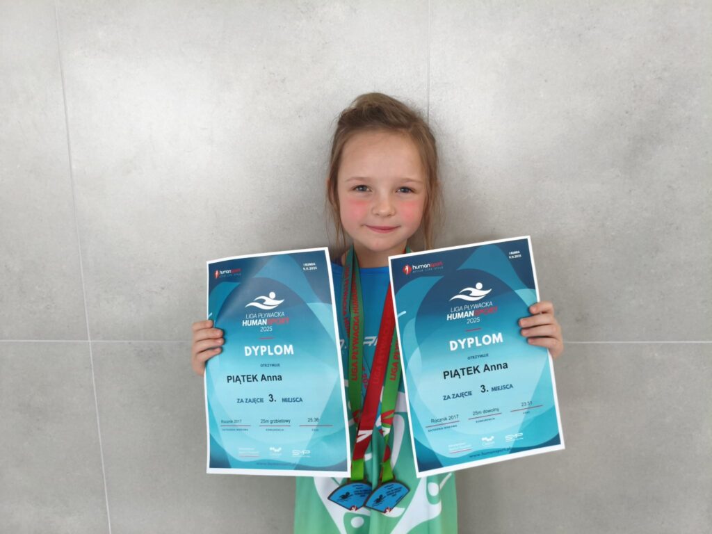 Ostatni długi weekend był dla wielu czasem odpoczynku, ale nie dla naszej uczennicy klasy drugiej — Ani Piątek, która podczas Ligi Pływackiej HumanSport wywalczyła aż dwa brązowe medale! 🥉🥉